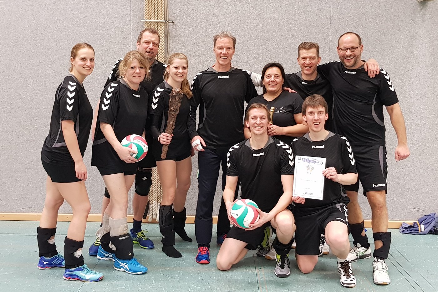 Unser Team "Hobby-Mixed I" setzt sich aus ehemaligen wie auch aktiven Volleyballer:innen, Trainer:innen und Vorständler:innen zusammen. Der Abend am Freitag wird genutzt, um zum Wochenabschluss nochmal ordentlich aus der Puste zu kommen und ist nicht zuletzt auch durch den Austausch zum Stand der aktuellen Saison geprägt.